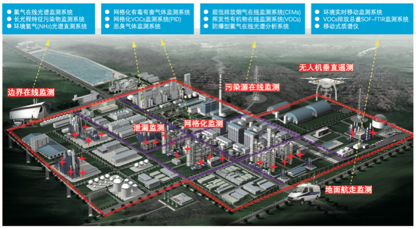 长期监测工业园区或其他大面积污染源污染物浓度水平,采用开放光程监测技术(比如长光程DOAS)为主,点式采样分析技术(比如GC-FID或GC-MS)为辅的技术路线。