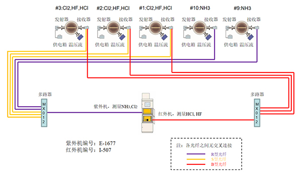 尊龙凯时科技提供的整体解决方案是采用非接触式差分吸收光谱法(DOAS),使用一条光路贯穿整个管道。光束通过光纤传输到分析仪,而这个分析仪又同时监测几个路径。满足同时监测全部排口,多种因子,包括了酸性气体、碱性气体和VOCs气体。该方案采用了先进的光谱法(UV/IR)监测酸碱气体和气相色谱法(GC-FID)监测VOCs气体。如下图: